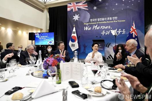 [서울=뉴스핌] 호주를 국빈 방문 중인 문재인 대통령과 부인 김정숙 여사가 13일(현지시간) 호주 캔버라 시내 한 호텔에서 열린 한국전 참전용사 및 유가족 초청 만찬에 참석해 박수를 치고 있다. [사진=청와대] 2021.12.14 photo@newspim.com 저작권자(c) 글로벌리더의 지름길 종합뉴스통신사 뉴스핌(Newspim), 무단 전재-재배포 금지