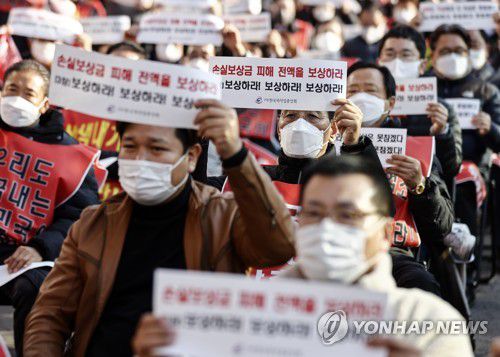 (서울=연합뉴스) 이영섭 기자 = 자영업자 단체인 '코로나19 피해 소상공인 자영업자 피해단체 연대'는 14일 서울 여의도 국회 앞에서 기자회견을 열고 더불어민주당 이재명 대선후보와 국민의힘 윤석열 대선후보에게 추경 예산 편성을 촉구했다.