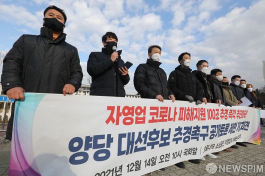 [서울=뉴스핌] 황준선 인턴기자 = 14일 오전 서울 여의도 국회 앞에서 코로나19 피해 소상공인 자영업자 피해단체 연대가 '자영업 코로나 피해지원 100조 추경 즉각 추진하라! 양당 대선후보 추경 촉구 공개 토론회 제안 기자회견'을 하고 있다. 2021.12.14 hwang@newspim.com 저작권자(c) 글로벌리더의 지름길 종합뉴스통신사 뉴스핌(Newspim), 무단 전재-재배포 금지