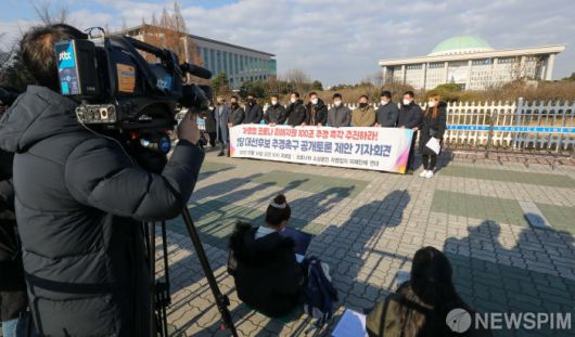 [서울=뉴스핌] 황준선 인턴기자 = 14일 오전 서울 여의도 국회 앞에서 코로나19 피해 소상공인 자영업자 피해단체 연대가 '자영업 코로나 피해지원 100조 추경 즉각 추진하라! 양당 대선후보 추경 촉구 공개 토론회 제안 기자회견'을 하고 있다. 2021.12.14 hwang@newspim.com