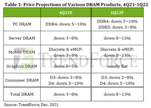 14일 대만 시장조사업체 트렌드포스는 올해 4분기 전체 D램 평균판매가격이 전분기대비 3~8% 하락하고, 내년 1분기에 8~13% 떨어질 것으로 예상했다. 트렌드포스는 "PC OEM(주문자상표부착생산)의 재고 수준이 수개월 새 줄어들었지만 그럼에도 내년 1분기 D램의 전체 수요는 하락 사이클에 진입하고 그에 따라 가격도 하방 궤도를 그릴 것으로 보인다"고 전망했다.