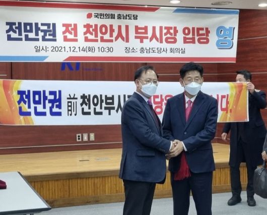 전만권(오른쪽) 전 천안부시장이 14일 국민의힘 충남도당에서 입당식을 갖고 이명수 충남도당위원장의 환영을 받았다. |