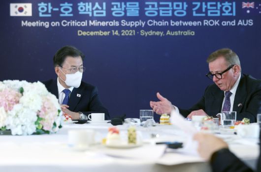 호주를 국빈 방문 중인 문재인 대통령이 14일 시드니 한 호텔에서 열린 한-호주 핵심 광물 공급망 간담회에 참석해 사이먼 크린 한-호주 경제협력위원회 이사장의 발언을 듣고 있다. 연합뉴스호주를 국빈방문 중인 문재인 대통령이 14일 현지 핵심 광물 생산 업체들과 간담회를 가졌다. 반도체는 물론 배터리 등 미래산업에 필요한 희토류, 리튬, 니켈 등 핵심광물 공급 다변화를 위해 선제적으로 움직이는 모습이다.