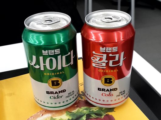 노브랜드 버거가 출시한 자체 탄산 음료 ‘브랜드 콜라’·‘브랜드 사이다’. 사진ㅣ인더뉴스 |