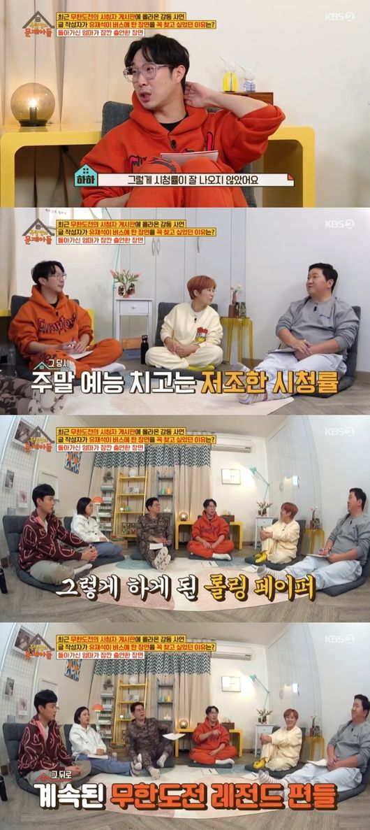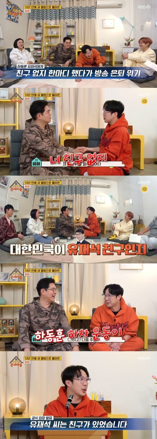 정형돈은 "하하가 무한도전을 만들었다"고 했고, 하하는 "저혼자서 되는건 없다. 던진건데 이런 분들이 잘 받쳐줬다"고 너스레를 떨었다. 반면 유재석때문에 하차 위기에 놓일뻔한 적도 있다고. 하하는 "국민청원까지 갔을거다. '그랬구나'라는 게임이 있다. 너무 할말 없어서 재석이형한테 '너 친구 없지'라고 한거다. 근데 대한민국이 유재석이 친구인줄 몰랐다. 방송 나가고 빵 터진거다. 그때는 신나서 현장 분위기 타고 쭉쭉 갔는데 다음주에 하동훈 하차 운동이 몇만명까지 모였다"고 당시 상황을 전했고, 정형돈은 "자칫 잘못했으면 청와대에서 답변할뻔 했다"고 받아쳤다.