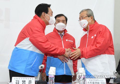 김종인 총괄선대위원장과 악수하는 윤석열 대선후보 |