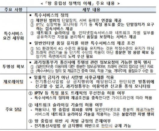주요 질답 중 하나인 'IPTV 등 특정 용도 트래픽의 우선전송 허용 여부'에 따른 답변은 '특수서비스의 정의와 제공조건을 충족한다면 가이드라인에 따라 허용'이다. '네트워크 슬라이싱 기술의 허용 여부' 관련 답변은 '허용되나, 망 중립성 회피를 위해 일반인터넷으로 충분히 제공가능한 서비스에 네트워크 슬라이싱 기술을 적용하는 것은 불합리한 차별 행위'이다.