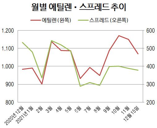 16일 에너지 정보분석업체 플래츠(Platts)에 따르면 이달 15일까지의 평균 에틸렌 스프레드는 톤(t)당 378달러로 지난해 12월 평균치에 비해 29.0% 하락했다. 지난 9·10월 400달러에서 11월 389달러로 내림세가 이어지는 중이다.