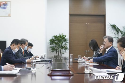 (서울=뉴스1) = 문재인 대통령이 13일 오후 청와대에서 샤프카트 미르지요예프 우즈베키스탄 대통령과 전화 통화를 하고 있다.(청와대 제공) 2020.4.13/뉴스1 |