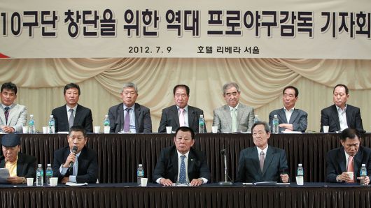 ▲ 역대 프로야구 감독 기자회견에 참석한 강태정 전 감독(윗줄 오른쪽 두 번째)