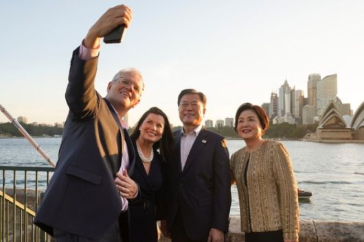 지난 15일 호주를 국빈방문한 문재인 대통령과 김정숙 여사가 스콧 모리슨 호주 총리 내외와 함께 시드니 오페라하우스를 배경으로 셀프카메라를 찍고 있다. 문 대통령 페이스북 갈무리 |