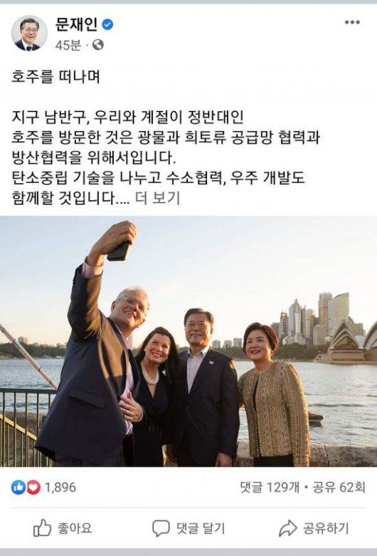 앞서 지난 15일 오전 문 대통령은 공식 사회관계망서비스(SNS)를 통해 시드니 오페라하우스를 배경으로 문 대통령 내외와 스콧 모리슨 호주 총리 내외가 함께 찍은 사진을 올렸다. 문 대통령은 "따뜻하게 환대해 주시고, 마지막 날까지 가족 동반으로 함께 해 주신 모리슨 총리께도 깊은 감사를 전한다"고 말했다.