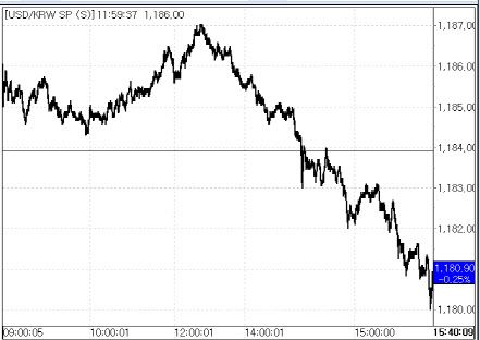 17일 서울외국환중개에 따르면 환율은 전 거래일 종가(1183.90원) 대비 3.00원 하락한 1180.90원에 마감했다. 이날 환율은 전일 대비 1.20원 오른 1185.10원에 시작해 장 중 한 때 1187.00원까지 올랐으나 오후들어 코스피 지수 상승 등 국내증시가 상승 폭을 키우자 하락 전환한 뒤 낙폭을 확대했다.