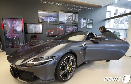 서울 서초구 페라리 반포 전시장에서 전시된 페라리 로마(Ferrari Roma). 페라리 로마는 4년 연속 ‘올해의 엔진상(International Engine of the Year)’을 수상한 페라리의 8기통 터보 엔진을 탑재, 620마력을 발휘한다. 2021.12.17/뉴스1 © News1 권현진 기자 |