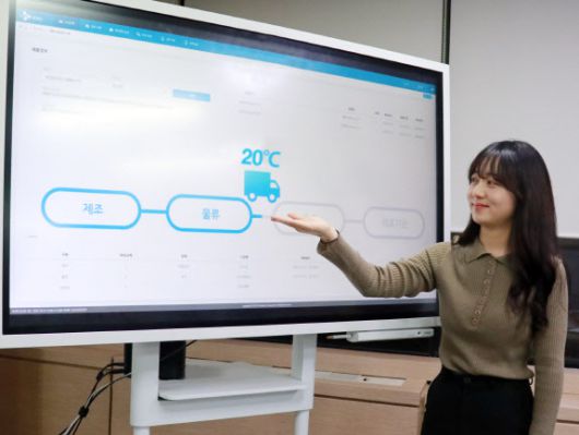 ▲19일 CJ대한통운 정보전략팀 직원이 블록체인으로 의약품 제조·물류·유통 전 과정 데이터를 안전하게 통합 관리하는 ‘블록체인 제약물류시스템’을 설명하고 있다. 의약품 운송 경로와 사용 기관, 수량 정보를 실시간으로 조회할 수 있으며 의약품을 실은 차량의 온도 데이터도 보여준다.(사진=CJ대한통운) |