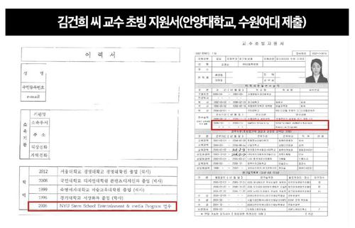 민주당 선거대책위원회 현안 대응 태스크포스(TF)는 이날 보도자료에서 "김 씨는 각 학교 교수직에 지원하며 이력서에 '2006 NYU 스턴 스쿨 엔터테인먼트 & 미디어 프로그램(NYU Stern School Entertainment & media Program) 연수'(안양대), '2006-10∼2006-11 뉴욕대 엔터테인먼트 앤드 미디어 비즈니스 이그제큐티브 프로그램(New York University Entertainment and Media Business Executive Program)'(수원여대)이라고 기재했다"고 밝혔다.