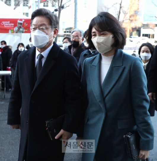 이재명 부부 순복음교회 예배 참석 - 이재명(왼쪽) 더불어민주당 대선후보와 부인 김혜경씨가 19일 서울 여의도순복음교회에 도착, 예배를 드리기 위해 이동하고 있다.김명국 선임기자 daunso@seoul.co.kr