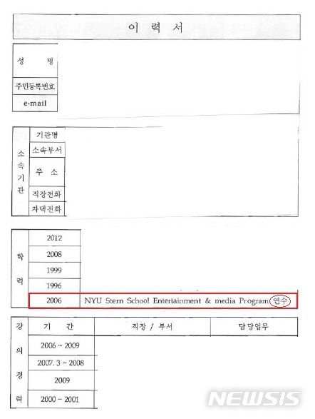 민주당이 공개한 자료에 따르면, 김씨가 수원여대에 낸 이력서에는 '학력사항 및 연수실적'에 뉴욕대 연수 경력이 기재돼 있다. 안양대 이력서에 쓴 뉴욕대 연수 경력은 '학력'란에 기재돼 있지만 이 지원서에는 연수 경력란이 따로 없다.