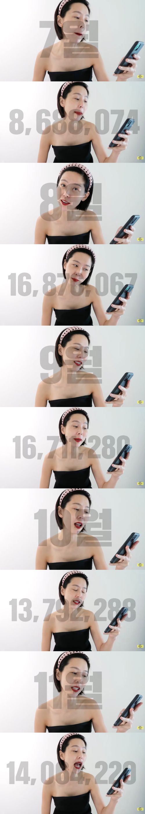 김나영은 '노필터TV' 어워즈 유튜브 하반기 광고 수익도 낱낱이 공개했다. 6개월 간의 '노필터TV' 광고 수익을 모두 더하면 7826만 7525원이라고. 김나영은 "'내가 키운다' 방송을 시작하면서 많은 분들이 '노필터TV'에도 관심을 가져주셨다. 그 관심 덕분에 조회수도 더 많이 올라가서 더 많은 수익이 발생했다. 월별 수익을 공개하겠다"고 밝혔다.