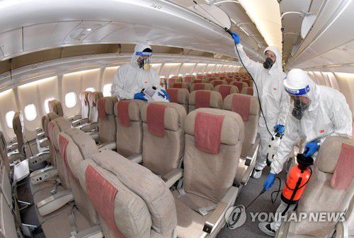 기내 방역소독 하는 관계자들 |
