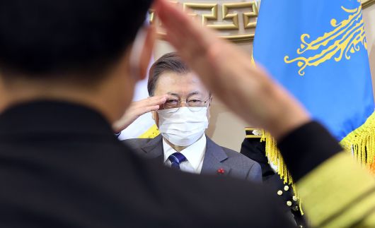 문재인 대통령이 20일 청와대 영빈관에서 열린 장성 진급·보직 신고 및 수치 수여식에서 진급 장성의 경례를 받고 있다. /연합뉴스 |
