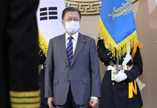 문재인 대통령이 20일 청와대 영빈관에서 열린 장성 진급·보직 신고 및 수치 수여식에 입장, 진급 장성들을 바라보고 있다.(사진=연합뉴스) |
