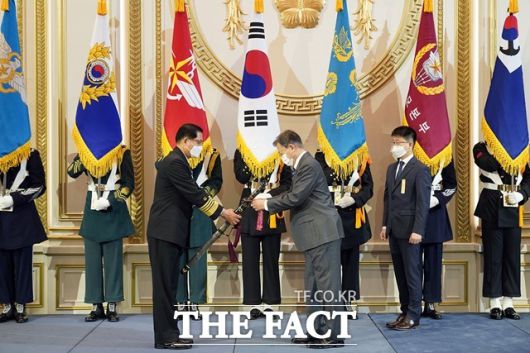 [더팩트ㅣ허주열 기자] 문재인 대통령은 20일 오전 청와대에서 장성 진급자들로부터 진급 및 보직신고를 받고 삼정검에 '수치'(끈으로 된 깃발)를 직접 매주며 진급을 축하했다.
