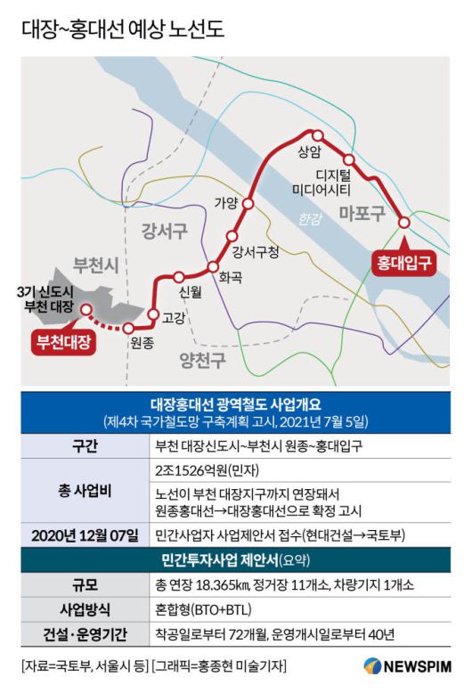 대장~홍대선은 3기 신도시 중 유일하게 지하철이 없는 대장신도시의 핵심 교통 대책으로 마련됐다. 3기 신도시 부천 대장지구에서 출발해 서울 서남부 지역을 거쳐 서울 홍대입구를 잇는 노선이다. 연장 20km, 총 사업비 2조1526억원 규모다.