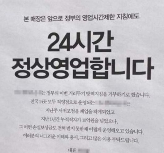 카페 측은 안내문에서 “본 매장은 앞으로 정부의 영업시간제한 지침에도 24시간 정상 영업한다”며 “정부의 이번 거리두기 방역지침을 거부하기로 했다”고 밝혔다.