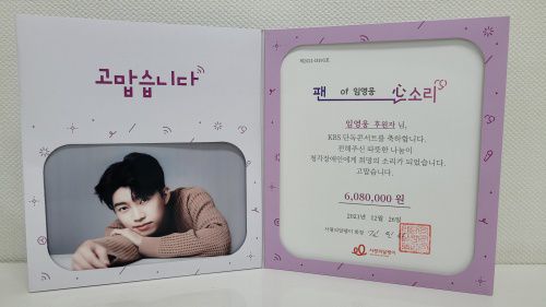 임영웅의 팬클럽 ‘웅바라기스쿨’이 임영웅의 KBS 단독콘서트 방송을 축하하며, 17일 청각장애인을 지원하는 사단법인 사랑의 달팽이에 가수 임영웅 이름으로 기부금 608만원을 전달했다.