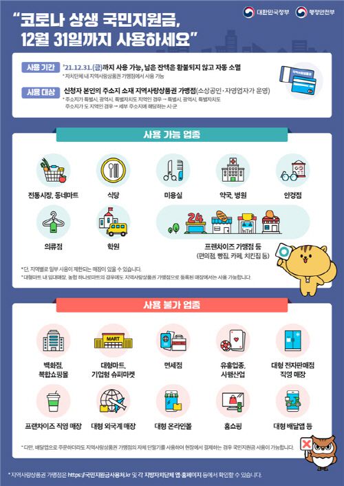 아시아투데이 배정희 기자 = 행정안전부(행안부)는 코로나 상생 국민지원금의 사용이 오는 31일에 종료됨에 따라 기간 내 모두 사용해줄 것을 21일 당부했다.