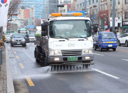 미세먼지 저감을 위해 살수차가 도로를 청소하고 있다.(사진=영등포구 제공) |