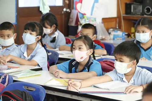 마스크를 쓰고 수업중인 방콕의 초등학생들 |