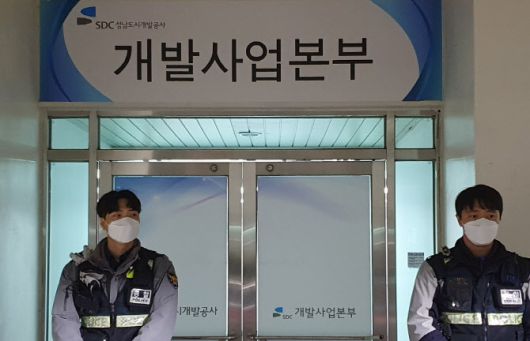 21일 오후 김문기 성남도시개발공사 개발1처장이 사무실에서 숨진 채 발견된 가운데 이날 경기 성남도시개발공사 개발사업본부 앞에 경찰들이 출입을 통제하고 있다 (사진=뉴시스) |