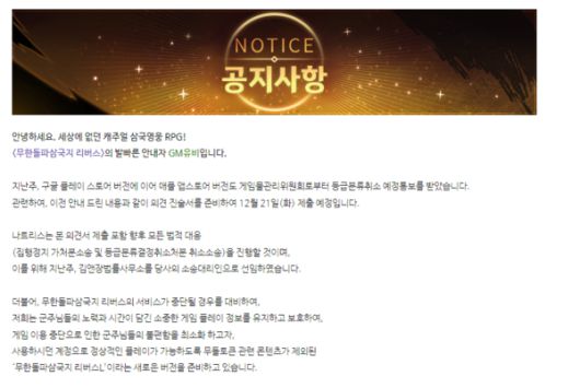22일 관련업계에 따르면 모바일 게임 '무한돌파삼국지 리버스'를 서비스하는 나트리스는 전날 작품의 공식 채널을 통해 "게임물관리위원회에 등급분류 결정취소 사유에 대한 소명자료 및 의견 진술서를 제출했다"고 밝혔다. 이 회사는 지난 10일 작품의 블록체인 기능과 관련해 게임위로부터 등급분류 결정취소 예정 통보를 받았다.