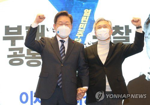 (서울=연합뉴스) 고상민 강민경 기자 = 더불어민주당과 열린민주당이 내주 합당 선언을 할 것으로 전망되는 가운데 이재명 대선 후보가 열린민주당 토크콘서트를 찾아 "힘을 합쳐야 한다"면서 여권 대통합에 드라이브를 걸었다.