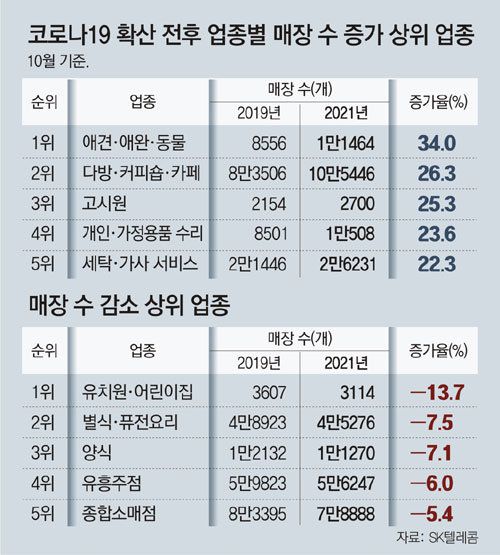 코로나19 확산에도 반려동물 관련 업소 등은 크게 늘었다. 올해 10월을 기준으로 전국에서 월 1회 이상 카드 매출이 발생하는 업소 및 매장은 전국 192만 개로, 코로나19 유행 전인 2019년 10월(179만 개)보다 7.3% 늘었다. 반려동물 관련 업소가 2년 새 34.0%로 가장 많이 늘었고, 커피숍·카페(26.3%), 개인·가정용품수리(23.6%)나 세탁·가사서비스(22.3%) 업소도 많이 늘었다. 코로나19로 집에 머무르는 시간이 늘고, 원격근무·온라인수업 등이 증가한 영향으로 보인다. 반면 유치원·어린이집(13.7%), 별식·퓨전요리(7.5%), 모텔·여관·여인숙(3.9%), 노래방·가라오케(3.3%) 등은 2년 전보다 줄었다.