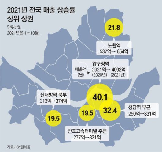 올해 한국의 1위 상권은 대표적인 부촌으로 꼽히는 압구정역 주변이 차지했다. 하루 평균 매출이 136억 원으로 가장 높았고, 월 평균 매출은 지난해 2921억 원에서 올해 4092억 원으로 40.1% 늘었다. 월 매출 기준으로 2위는 서울 강남역 북부(4030억 원), 3위는 강남역 남부(3586억 원)였다.