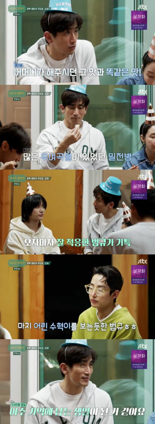 차인표는 정성스럽게 생일상을 차려준 멤버들에게 감사한 마음을 표현하며 "오늘 범규가 와서 너무 기뻤다. 범규가 우리랑 잘 맞는 것 같다. 적응을 잘 해줘서 기특하다"라며 "마치 어린 수혁이를 보는 듯하다"라고 말했다.