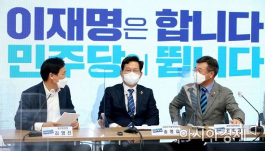 송영길 더불어민주당 상임선대위원장(가운데)이 24일 서울 여의도 중앙당사에서 열린 선거대책위원회 본부장단 회의에 참석, 회의 시작 전 윤호중 공동선대위원장(오른쪽)과 김영진 총괄본부장과 이야기를 나누고 있다./윤동주 기자 doso7@ |