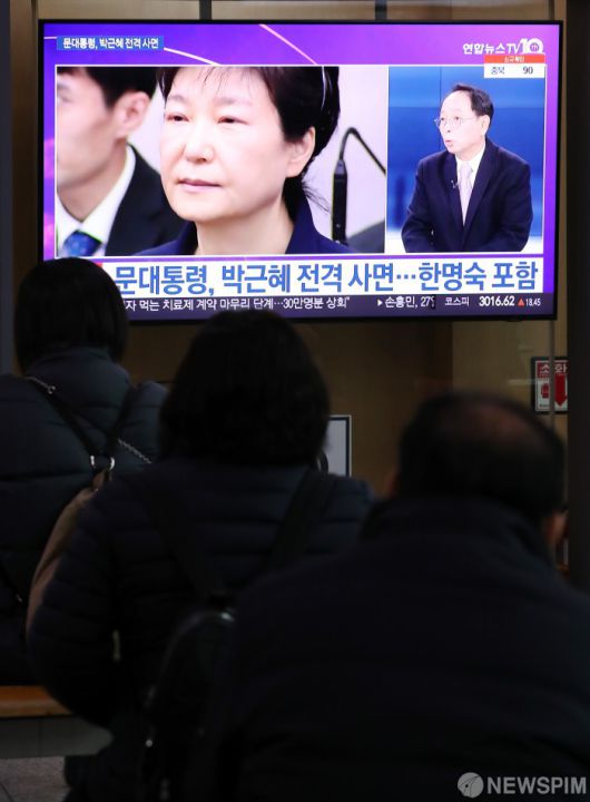 [서울=뉴스핌] 정일구 기자 = 24일 오전 서울 용산구 서울역 대합실에서 시민들이 박근혜 전 대통령에 대한 특별사면 관련 뉴스를 시청하고 있다. 정부는 이날 2022년 새해를 맞아 오는 31일자로 국정농단 사건으로 수감 중인 박 전 대통령과 한명숙 전 국무총리를 비롯해 일반 형사범 등 3094명을 특별사면·감형·복권 조치했다고 밝혔다. 2021.12.24 mironj19@newspim.com