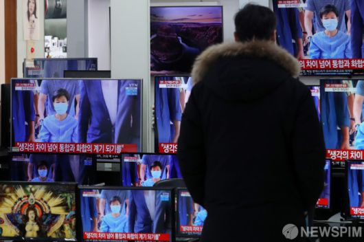 [서울=뉴스핌] 정일구 기자 = 24일 오전 서울 용산구 용산전자상가에서 시민들이 박근혜 전 대통령에 대한 특별사면 관련 뉴스를 시청하고 있다. 정부는 이날 2022년 새해를 맞아 오는 31일자로 국정농단 사건으로 수감 중인 박 전 대통령과 한명숙 전 국무총리를 비롯해 일반 형사범 등 3094명을 특별사면·감형·복권 조치했다고 밝혔다. 2021.12.24 mironj19@newspim.com