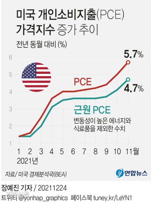 연준은 12월 연방공개시장위원회(FOMC) 정례회의에서 내년 말까지 물가상승률이 2.6% 수준으로 내려올 것으로 전망했으나, 오미크론 변이의 확산으로 공급망 회복이 지연되고 주거비용이 추가로 오른다면 이마저도 장담하기 어렵다. 일반적으로 잘 알려진 물가지표는 소비자물가지수(CPI)지만, 연준이 인플레이션 추이를 관찰할 때 가장 선호하는 지표는 PCE와 근원 PCE 지수다.