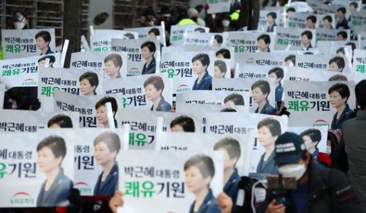 24일 오후 서울 강남구 삼성서울병원 앞에서 열린 박근혜 전 대통령 석방 축하 및 건강 기원 집회(제215차 태극기집회)에서 지지자들이 박 전 대통령 얼굴이 그려진 손 피켓을 들고 있다. 뉴시스 |