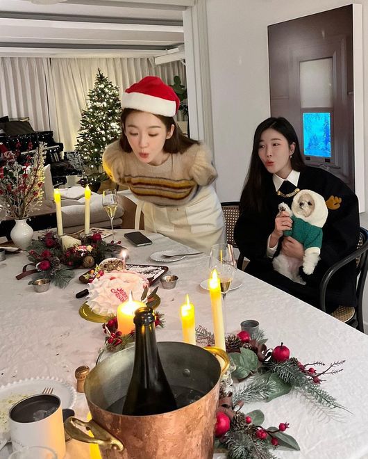 사진 속 이해리는 강민경 집에서 반려견과 함께 즐거운 크리스마스 파티를 즐기고 있는 모습. 두 사람은 거대한 트리와 산타 모자, 조명, 초 등을 활용해 크리스마스 분위기를 만끽하고 있다.
