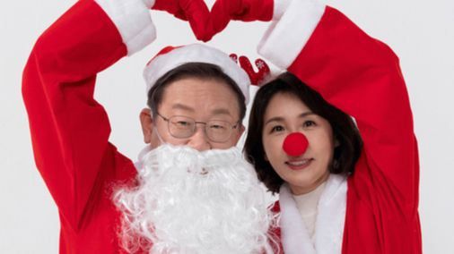 산타와 루돌프 복장을 한 이재명 더불어민주당 대선후보와 부인 김혜경씨 부부의 뮤직비디오 촬영 현장 스틸컷. 사진 더불어민주당 선대위 |