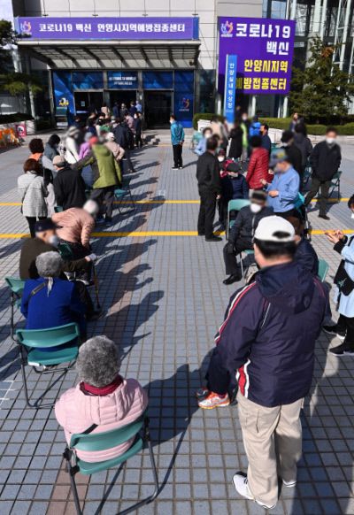 지난 4월 경기도 안양종합운동장 보조경기장에 마련된 예방접종센터에서 접종 대상 고령자들이 줄을 서서 순서를 기다리고 있다.|연합뉴스 |