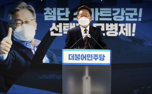 이재명 더불어민주당 대선후보는 26일 박근혜 전 대통령 사면과 관련 청와대와 사전교감이 없었다고 밝혔다. 이 후보가 지난 24일 여의도 민주당 당사에서 ‘스마트강군, 선택적 모병제 공약 발표’를 갖고 있다. [연합] |