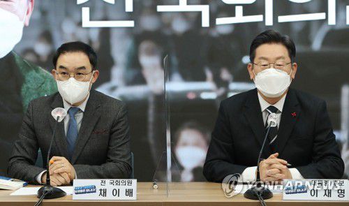 더불어민주당 이재명 대선후보가 지난 10일 오전 서울 영등포구 더불어민주당사에서 열린 바른미래당 출신 김관영, 채이배 전 의원의 입당식에서 환영사를 하고 있다. [연합뉴스 자료사진] |