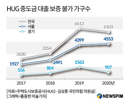 중도금 대출 보증을 받을 수 없는 전국의 주택 가구수는 2017년 2620가구였으나 지난해에는 6103가구로 크게 늘었다. 서울에서도 같은 기간 1927가구에서 4553가구로 배 이상 증가했다.